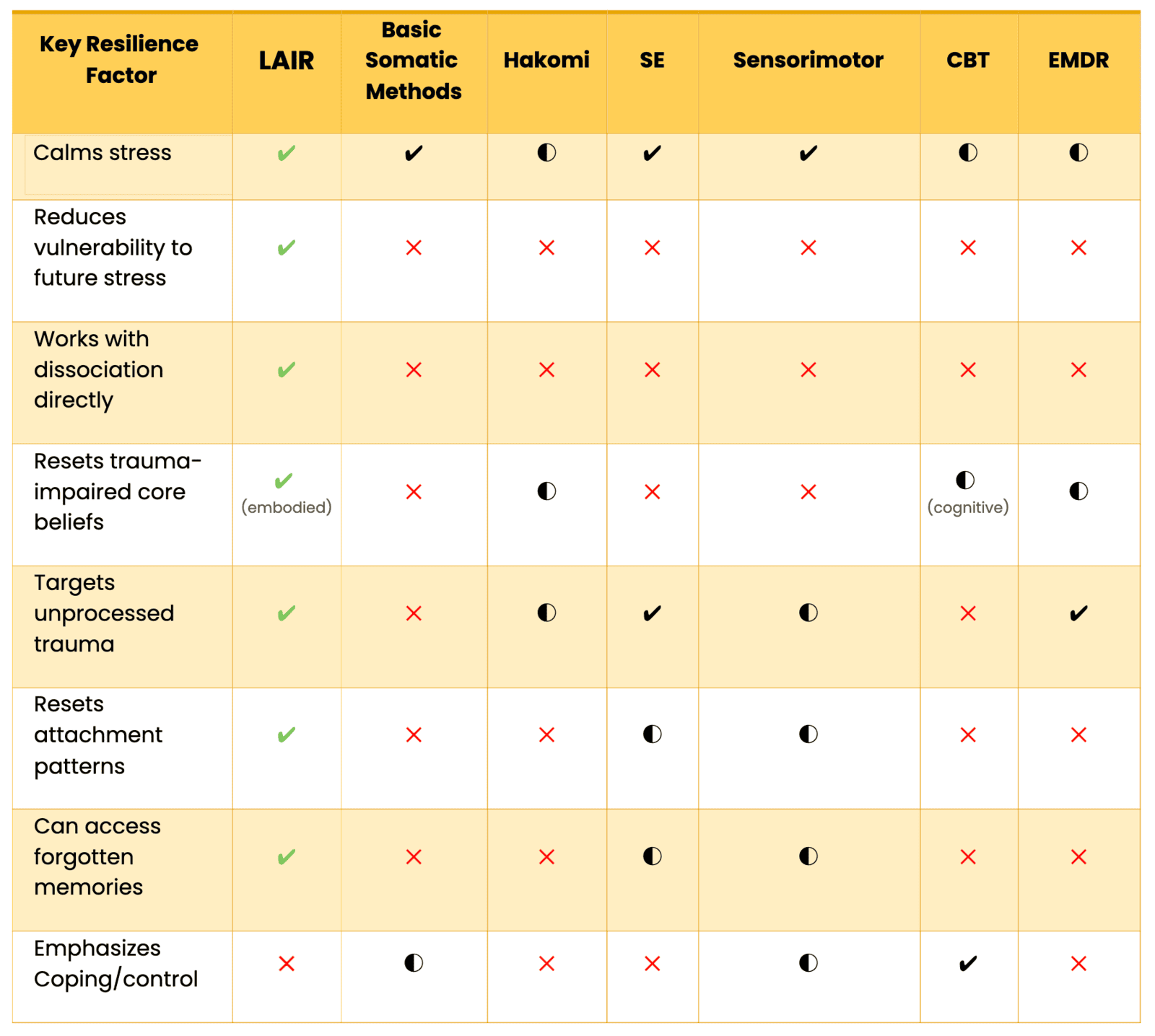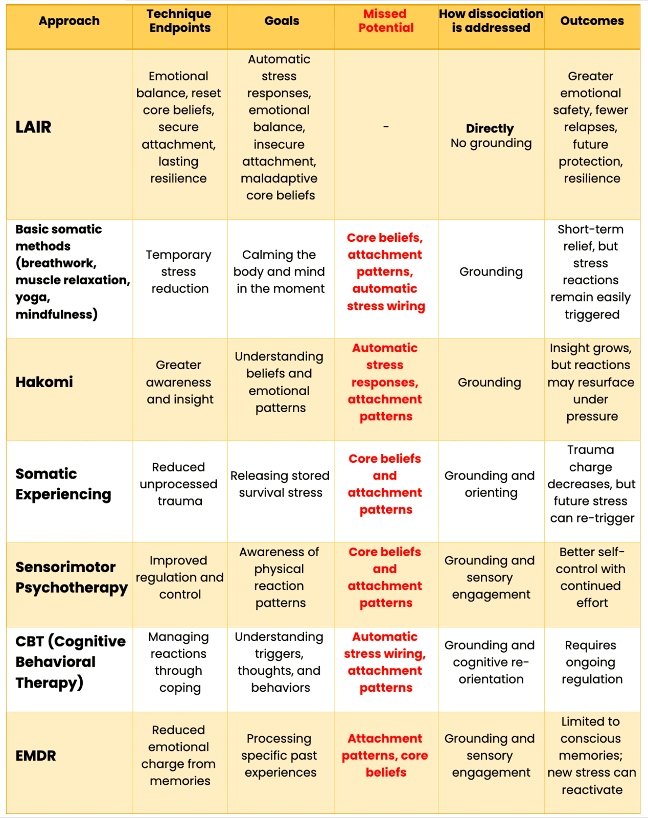 LAIR shares the bottom‑up, sensory‑based spirit of approaches like Hakomi, Sensorimotor Psychotherapy, and Somatic Experiencing, but it goes further by being a systematic, brain‑first recalibration rather than a moment‑to‑moment body‑awareness tool.